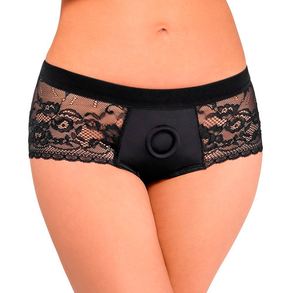 Braguita negra fabricada en precioso encaje floral. La parte delantera tiene una inserción de microfibra opaca y un anillo de sujeción elástico integrado (Ø 3,5 cm) para insertar un consolador/vibrador con base. Elástico y suave en todo el cuerpo, con una cómoda cintura elástica para un gran confort.