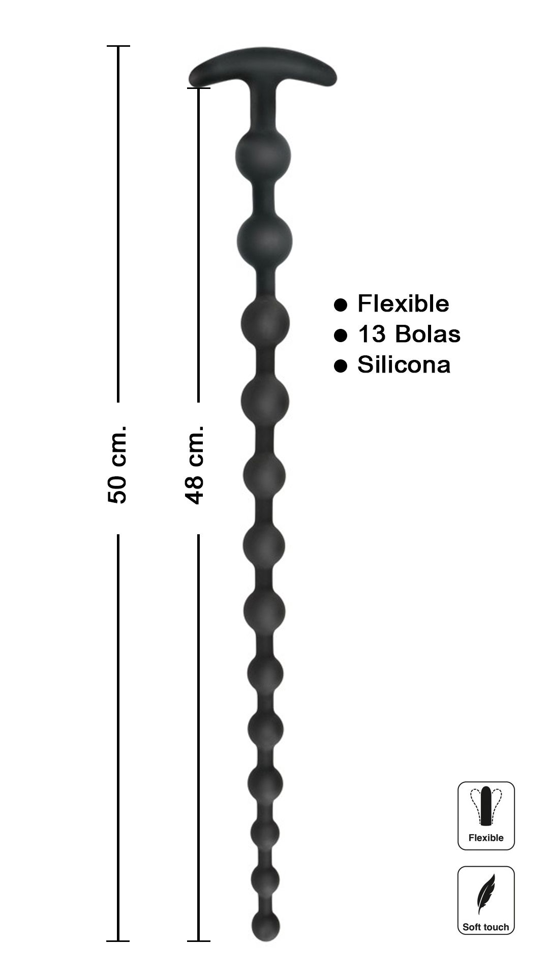 Cadena de bolas anales altamente flexibles con 13 estimulantes cuentas. La pequeña bola final es fácil de insertar y aumenta de diámetro hasta convertirse en una excitante bola de 3 cm. Con una longitud de medio metro. Gran diversión anal que puede llegar muy profundo