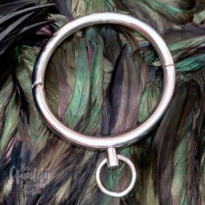 Collar de metal cromado se cierra con una llave allen incluida y acabado brillante. El collar tiene una anilla para enganchar una cadena con mosquetón, una cuerda o cualquier otro artículo de bondage.