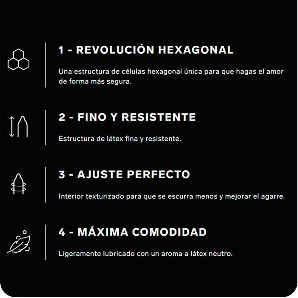 LELO HEX son condones muy finos que te ofrecen una sensación sublime y un ajuste impecable. Su famosa estructura hexagonal, junto con su textura interior para conseguir un agarre mejor, los convierten en los mejores condones que probarás jamás.