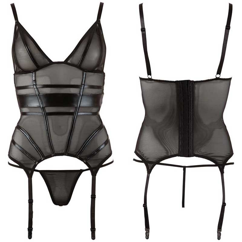 Top de tirantes ceñido a la figura, hecho de powernet transparente, frente con muchas rayas longitudinales y cruzadas hechas de wetlook negro. En la parte trasera con cierre de gancho. Las correas y los 4 tirantes son ajustables. Incluyendo el tanga hecho completamente de powernet.