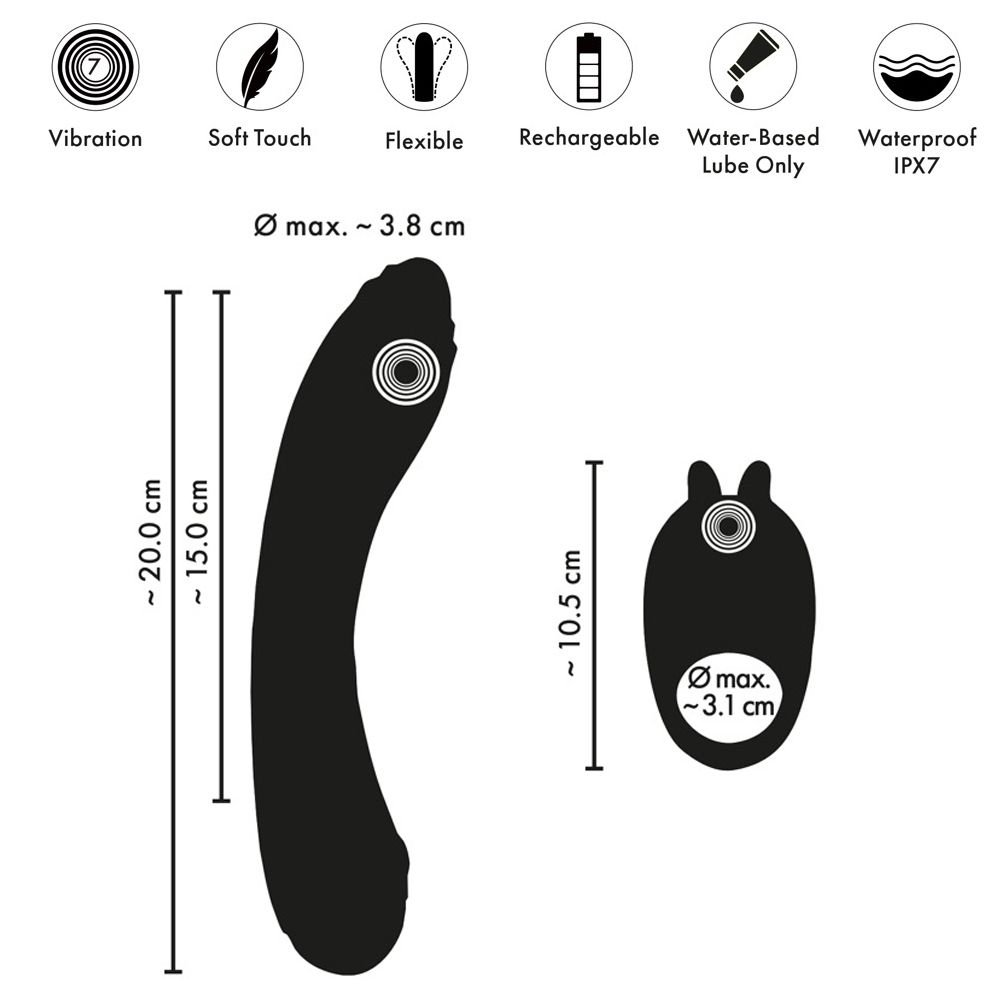 Ambos juguetes de silicona tienen una forma ideal para que no sólo encajen entre sí, sino que también se adapten perfectamente al cuerpo y a los movimientos. El vibrador idealmente curvado alcanza la zona G con sus suaves estrías. Con su estimulador de conejito curvado, el anillo alcanza fácilmente el clítoris, independientemente de si se coloca sobre el vibrador o el pene. La sedosa superficie Soft Touch hace que introducirlo, deslizarlo y jugar con él sea un auténtico placer.