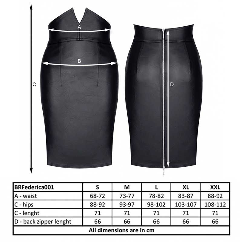 Impresionante falda con cremallera muy ajustada en caderas en estilo piel realizado en eco-piel. Cuenta con una cremallera en la parte central de la falda
