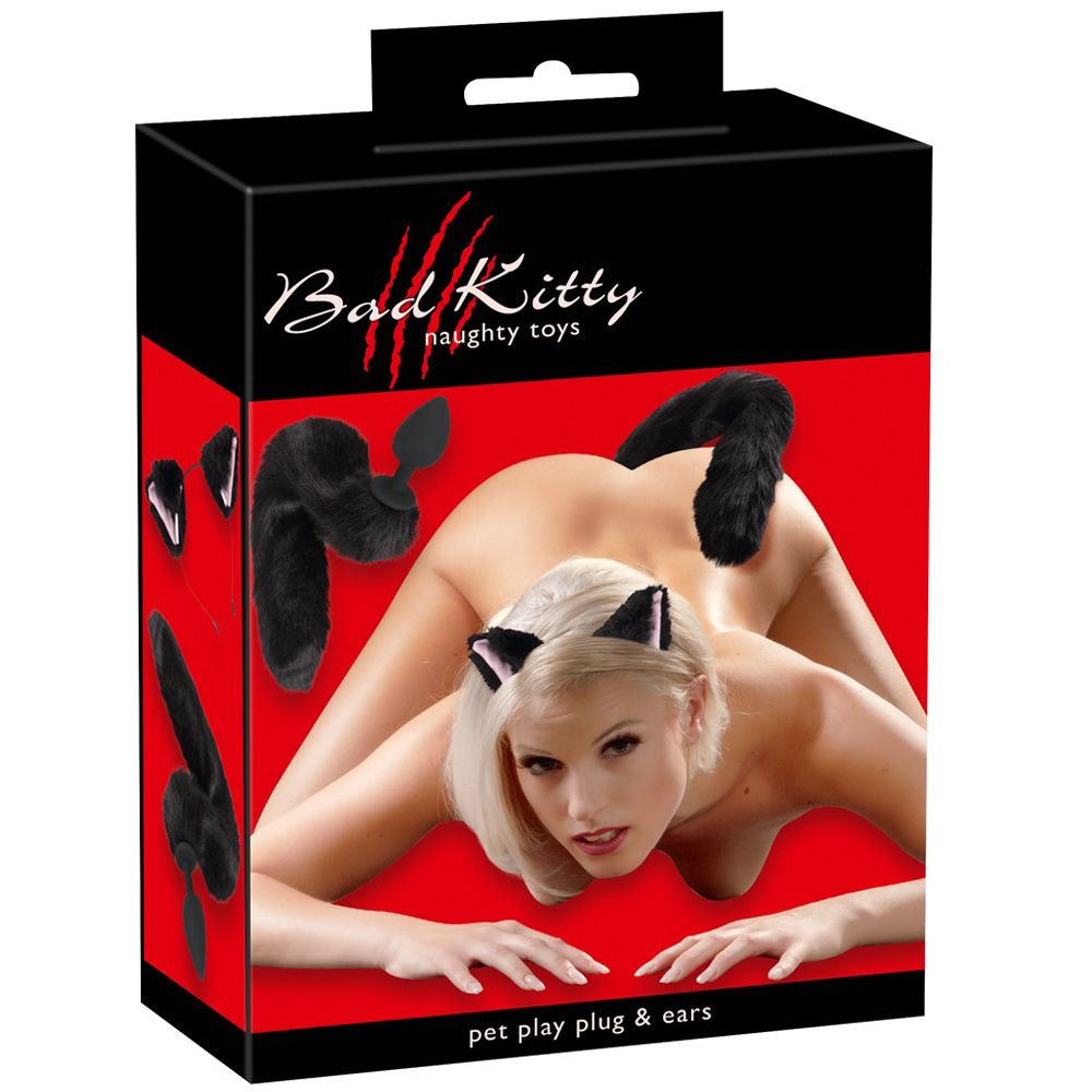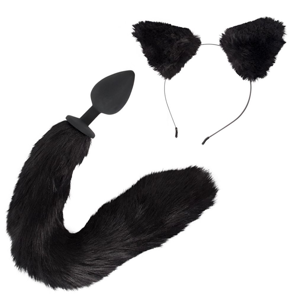 Set negro de tapón anal cola de gato y diadema con orejas.